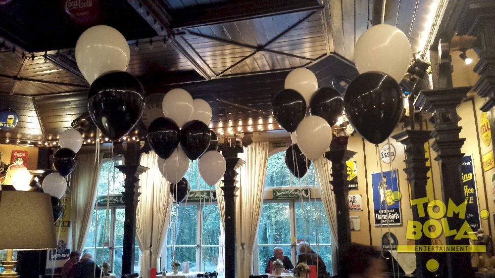 - Saaldekoration und Tischdekoration aus Luftballons sind aufeinander abgestimmt.